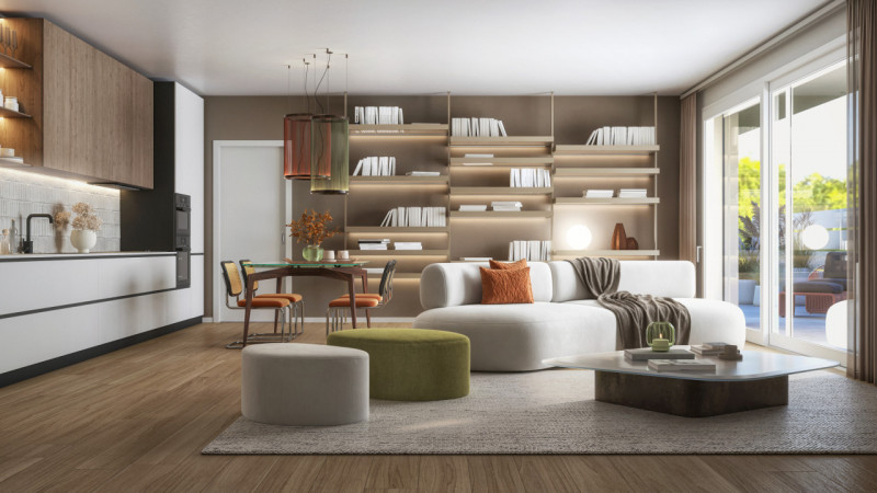 - soggiorno di 39 mq con cucina a vista naturalmente illuminata grazie alla grande vetrata che si affaccia sul giardino privato
